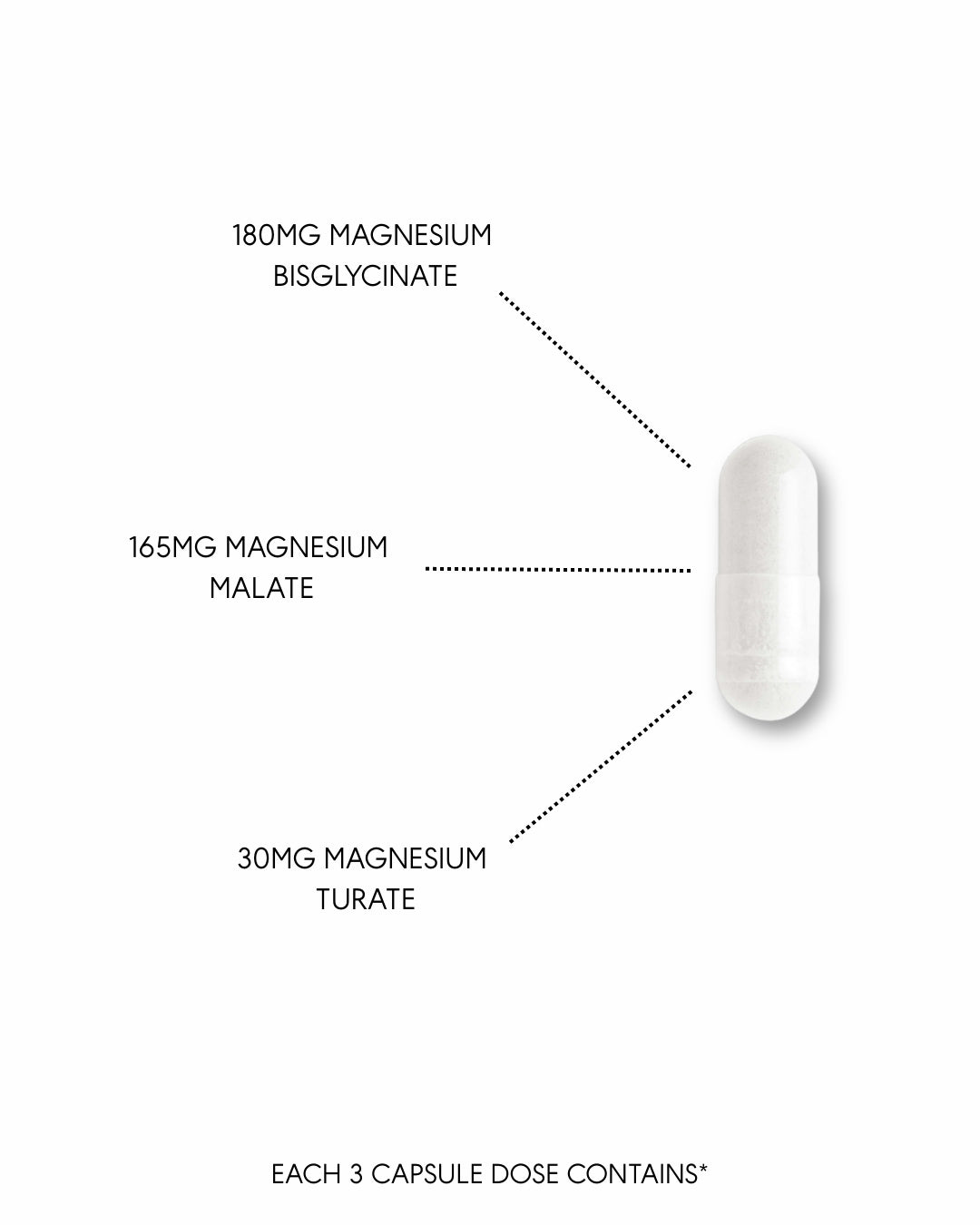 Magnesium Malate, Magnesium Bisglycinate, Magnesium Taurate, Micocrystaline Cellulose, Magnesium Stearate, Silica, Vitamin B6 Pyridoxine, Plant Based Captule